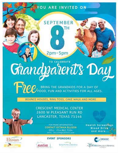 A celebration for Grandparents Day from 2:00pm to 5:00pm. Free bring the grandkids and family for a day of food, fun, and activities for all ages; bounce house, ring toss, cake walk and more. There will be health screenings and blood drive.